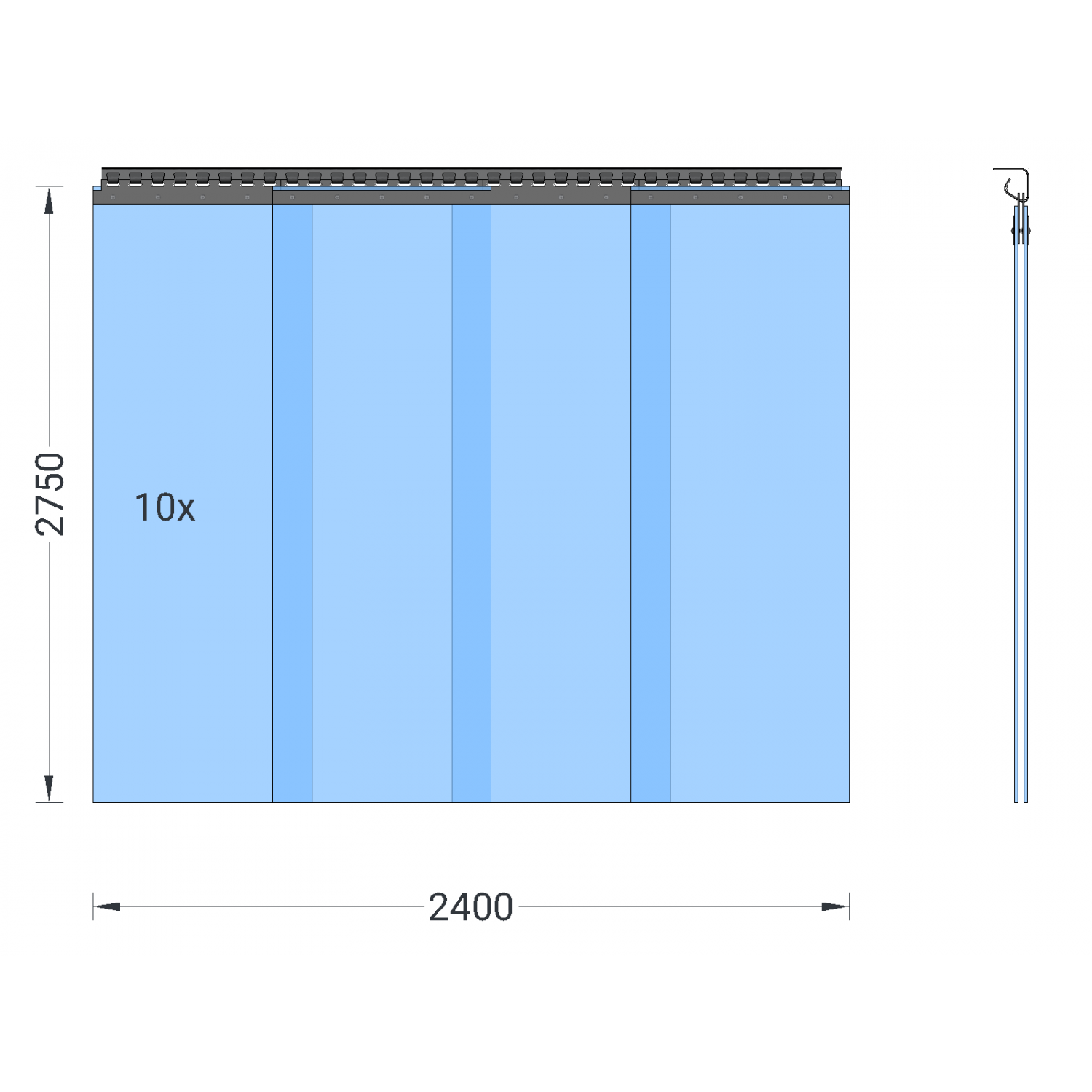 PVC-Streifenvorhang Bausatz für eine maximale Breite von ca.2,80 m bei einer Überlappung von ca. 10,0 cm (2 Haken) bzw. ca. 2,50 m Breite bei einer Überlappung von ca. 15,0 cm (3 Haken). Die Vorhangbreite kann jederzeit weiter reduziert werden, indem einzelne Streifen um weitere Haken überlappt werden.
