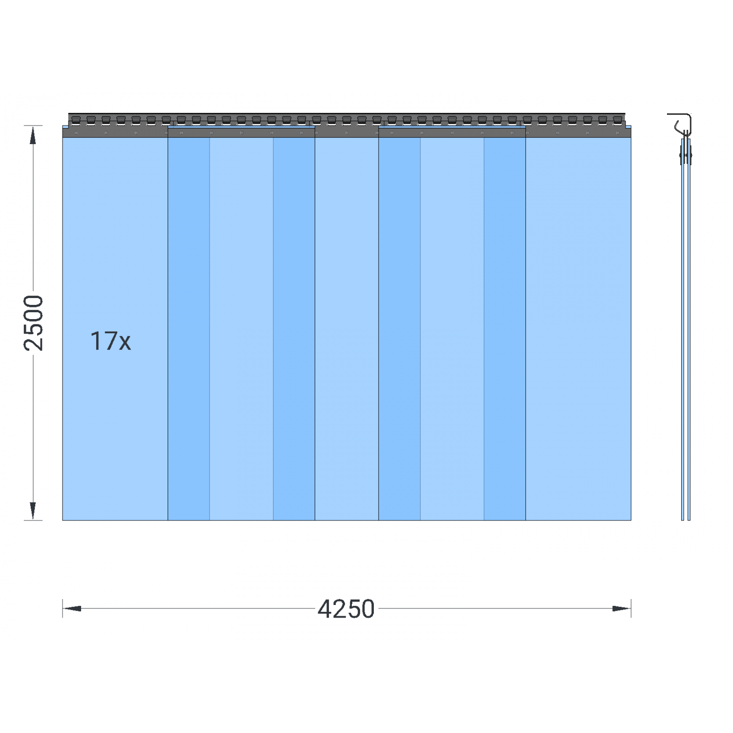 PVC-Streifenvorhang Bausatz für eine maximale Breite von ca.4,90 m bei einer Überlappung von ca. 10,0 cm (2 Haken) bzw. ca. 4,25 m Breite bei einer Überlappung von ca. 15,0 cm (3 Haken). Die Vorhangbreite kann jederzeit weiter reduziert werden, indem einzelne Streifen um weitere Haken überlappt werden.