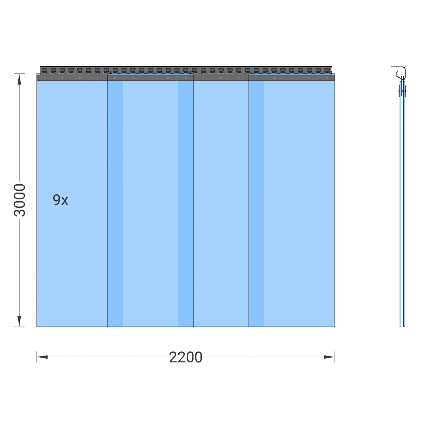 PVC-Streifenvorhang Bausatz für eine maximale Breite von ca.2,50 m bei einer Überlappung von ca. 10,0 cm (2 Haken) bzw. ca. 2,25 m Breite bei einer Überlappung von ca. 15,0 cm (3 Haken). Die Vorhangbreite kann jederzeit weiter reduziert werden, indem einzelne Streifen um weitere Haken überlappt werden.