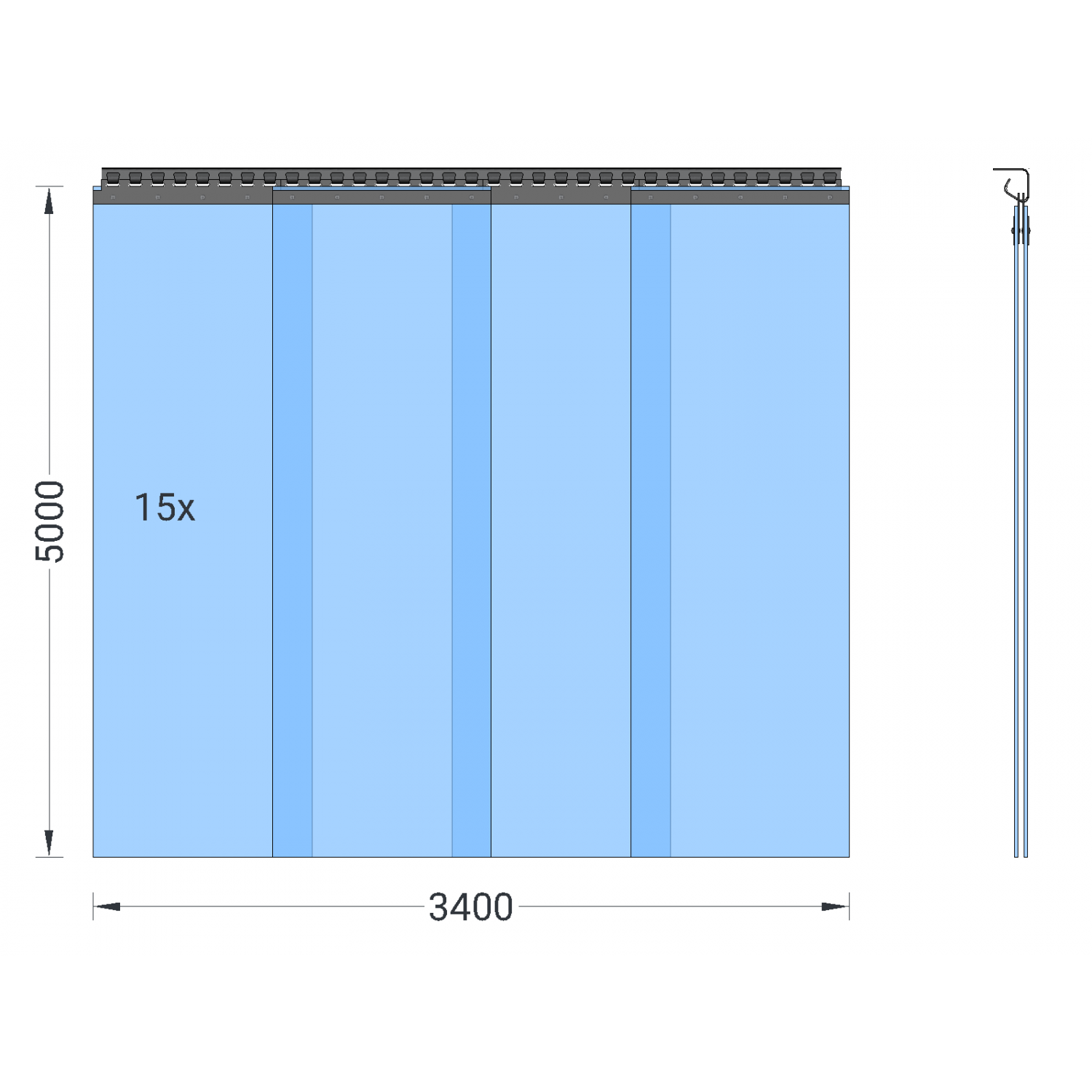 PVC-Streifenvorhang Bausatz für eine maximale Breite von ca.4,30 m bei einer Überlappung von ca. 10,0 cm (2 Haken) bzw. ca. 3,75 m Breite bei einer Überlappung von ca. 15,0 cm (3 Haken). Die Vorhangbreite kann jederzeit weiter reduziert werden, indem einzelne Streifen um weitere Haken überlappt werden.